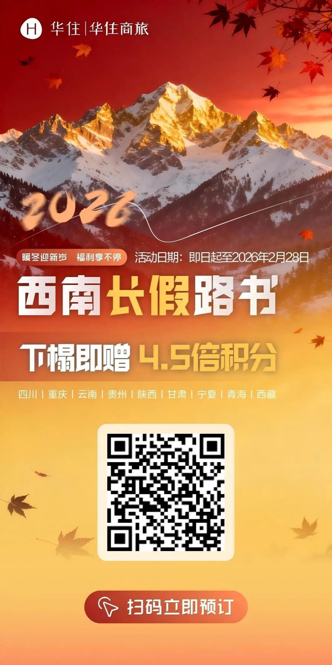 即日起至2026年2月28日,西财校友入住华住旗下西南区域任一美居、漫心、诺富特酒店,房费积分直接飙升4.5倍!商旅出行、城市Staycation,每一程皆更快兑换免费房晚、升级权益,让智慧投资从差旅开始。