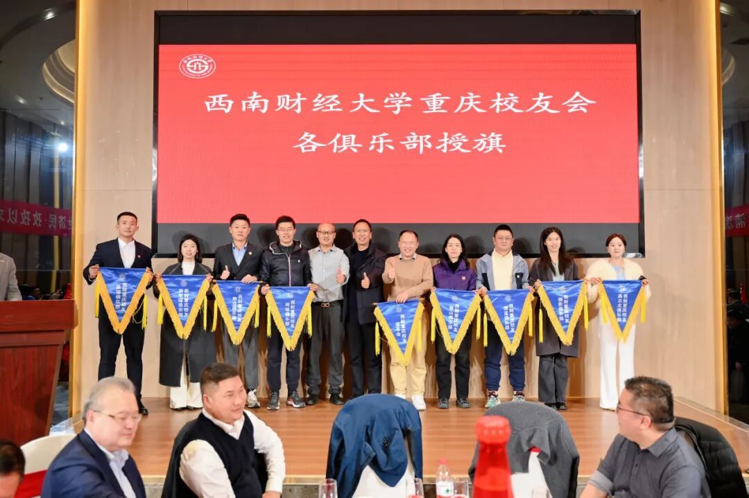 活动现场还举行了简朴庄重的授旗仪式,各学院重庆分会及各文体俱乐部代表依次接旗,标志着校友会组织建设进一步完善。现场文艺演出与抽奖环节气氛热烈,尽显西财人的才华与情谊。